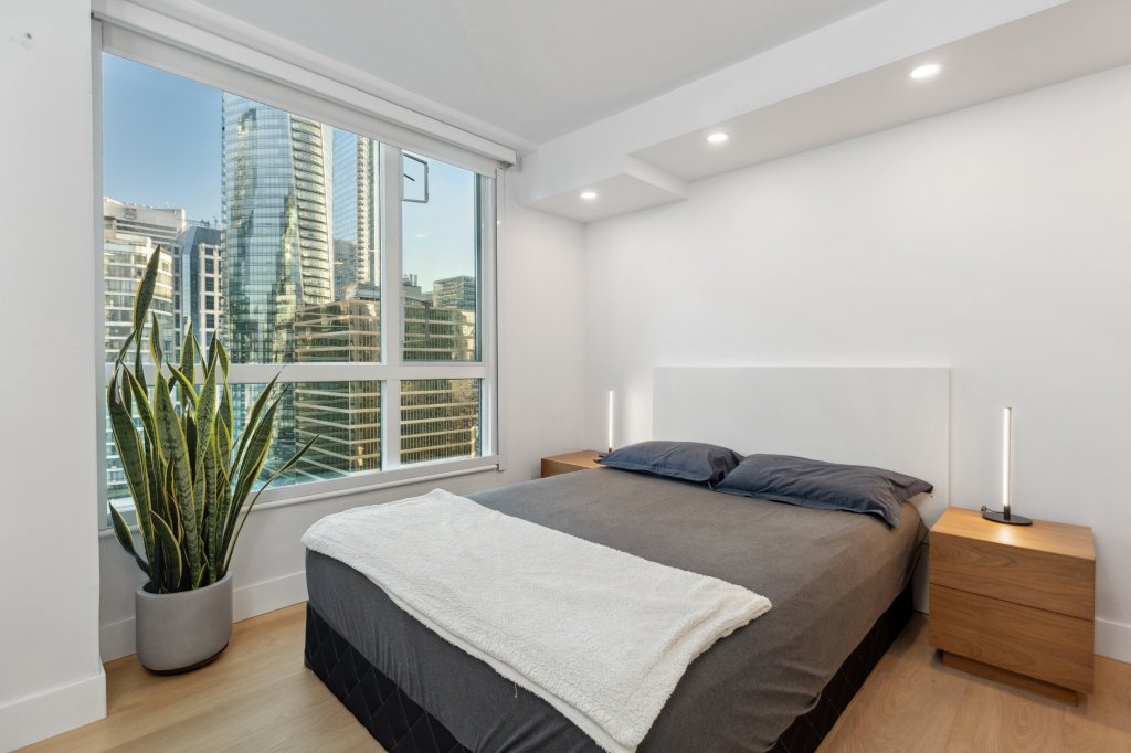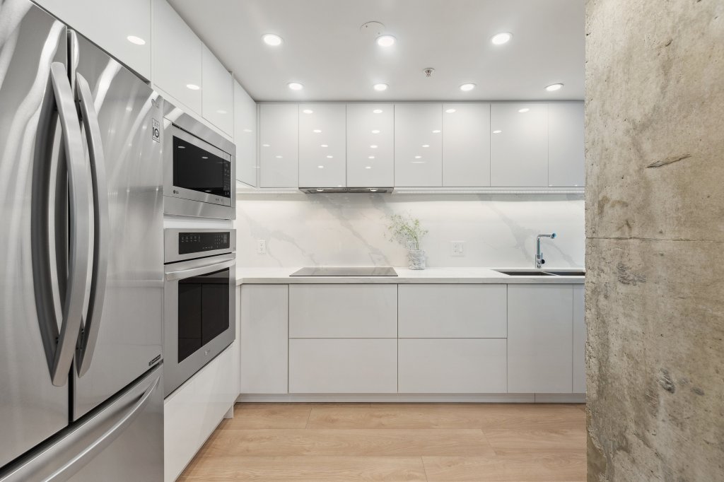 Industrial chic meets modern luxury in this striking Gastown loft. Exposed brick walls, wooden beams, and soaring ceilings give this space a raw, edgy charm. The floor-to-ceiling windows flood the interior with light, while polished concrete floors add a contemporary touch. The kitchen boasts sleek stainless-steel appliances and an open-concept layout, making it an entertainer’s dream. A floating staircase leads up to the lofted bedroom, where a glass railing maintains the open feel of the space. With its mix of heritage and modernity, this loft embodies the soul of Gastown.